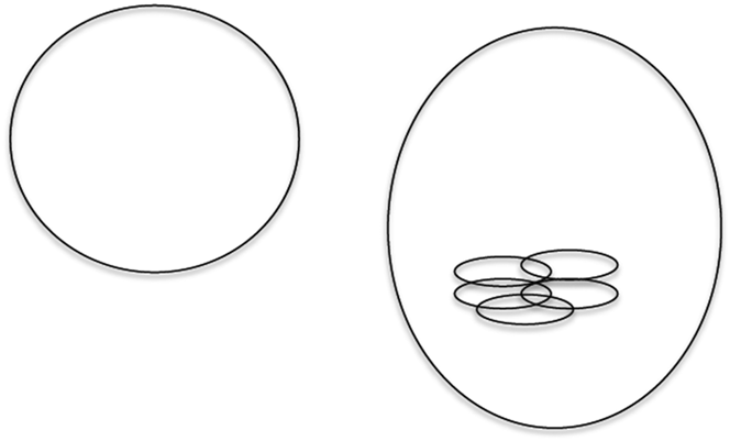 Work by Suttle and Goldberg (Reference Suttle and Goldberg2011) and Perek (Reference Perek2016) has argued that the critical factor in determining when a construction is productive is coverage, an idea borrowed from the non-linguistic categorization literature (Goldberg, Reference Goldberg2006, p. 98; Osherson, Smith, Wilkie, Lopez, & Shafir, Reference Osherson, Smith, Wilkie, Lopez and Shafir1990). Coverage relates type frequency, variability, and similarity of the coinage to attested tokens: all factors that have been independently found to be relevant. The idea is depicted in Figure 1. A new coinage is acceptable to the extent that the semantic (pragmatic, and/or phonological) space is well covered by the smallest convex category that encompasses both the coinage and attested instances that share the same formal pattern: the category is represented by the larger oval. Exemplars with shared form are represented in a high degree similarity space, projected here onto two dimensions for expository purposes. The degree of coverage corresponds to the degree to which the attested instances fill or ‘cover’ the entire category.
