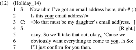 Like previous examples, email is not treated as the mode for booking confirmations, despite there being an address on file that, in this case, C has confirmed in the beginning of the call (see extract (11)). Furthermore, while “paperwork” in the offer of email or post can be used for any type of files or written agreements, the etymology of the word means that it may be heard to indicate that a physical piece of paper would be expected. In this sense, the alternative interrogative is ‘tilted’ in favor of the postal option (cf. Llewellyn Reference Llewellyn2015). Although C opts for email, his choice is not phrased as a matter of preference, but as something that “will do”, thus orienting to postal confirmation as the expected or better option. Additionally, S's explanation that the email confirmation will “come pretty much instantly” (lines 6–7), infers that C may have been heard not to be a regular email user, thus requiring a somewhat redundant explanation for someone accustomed to email use.
