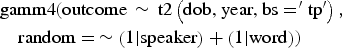 To reduce the computational complexity of the models being fit, however, the data was partially summarized before models were fit. For every speaker, the relevant outcome variable (normalized F1, normalized F2, or normalized F2 – normalized F1) was averaged for each lexical item that speaker produced. For example, one speaker produced 93 tokens of prevoiceless /ay/, 53 of which were like. The average of normalized F1 for like was taken for this speaker, reducing 53 tokens to one average for the word type. This was similarly done for six tokens of fights, four tokens of nice, and so on, resulting in 18 word type averages for this speaker. This was done for all speakers, dramatically reducing the volume of data to be modeled and the complexity of the random effects structures. It is still possible to include a random intercept for word type, since many word types were produced by multiple speakers. The exception to this procedure is the modeling of filled pauses, which was given a binary coding of 0 for UH and 1 for UM.