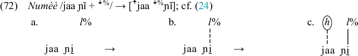 In Numèè, the boundary l% is realised only on utterance-final monomoraic syllables, both registerless and downstepped (creating a double downstep in the latter case), if they are preceded by a registerless syllable, that is, one that can undergo pre-downstep raising, as seen in §3.4. This is illustrated in (72) and (73), which show the derivations of (24) and (25).