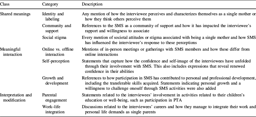 Research has also shown that a sense of community can be established in a virtual space despite physical distance (Mirbahaeddin & Chreim, Reference Mirbahaeddin and Chreim2024). Virtual peer support platforms have shown the ability to engage diverse populations, including men (who are typically less likely to seek mental health support) and underrepresented groups who report higher rates of loneliness (Bravata et al., 2023). Research on online forums for single mothers reveals that members rely on these groups for emotional support, parenting knowledge, work-life balance, companionship, and self-esteem (Hudson et al., Reference Hudson, Campbell-Grossman, Keating-Lefler, Carraher, Gehle and Heusinkvelt2009), aligning with motivations for social participation (Taylor & Conger, Reference Taylor and Conger2017). This present study brings a different perspective to the ongoing discourse by examining online interactions among single mothers through a symbolic interactionism approach.