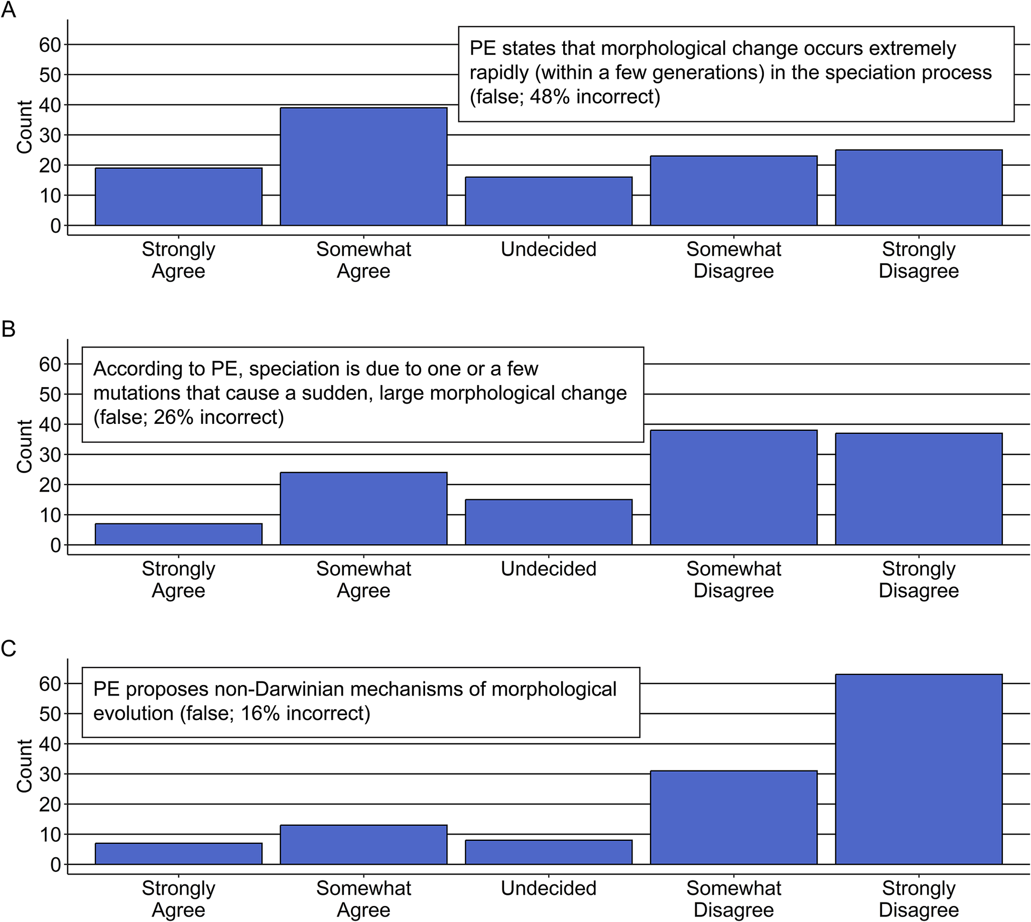 Figure 6. Items revealing critical misconceptions about the rate and cause of morphological change. A, 48% of respondents incorrectly think that punctuated equilibrium claims that morphological change occurs within just a few generations (Item 8), with another 13% undecided. B, 26% of respondents think punctuated equilibrium claims speciation is due to one or a few mutations (Item 10). C, 16% of respondents think punctuated equilibrium proposes non-Darwinian mechanisms for morphological evolution (Item 6).