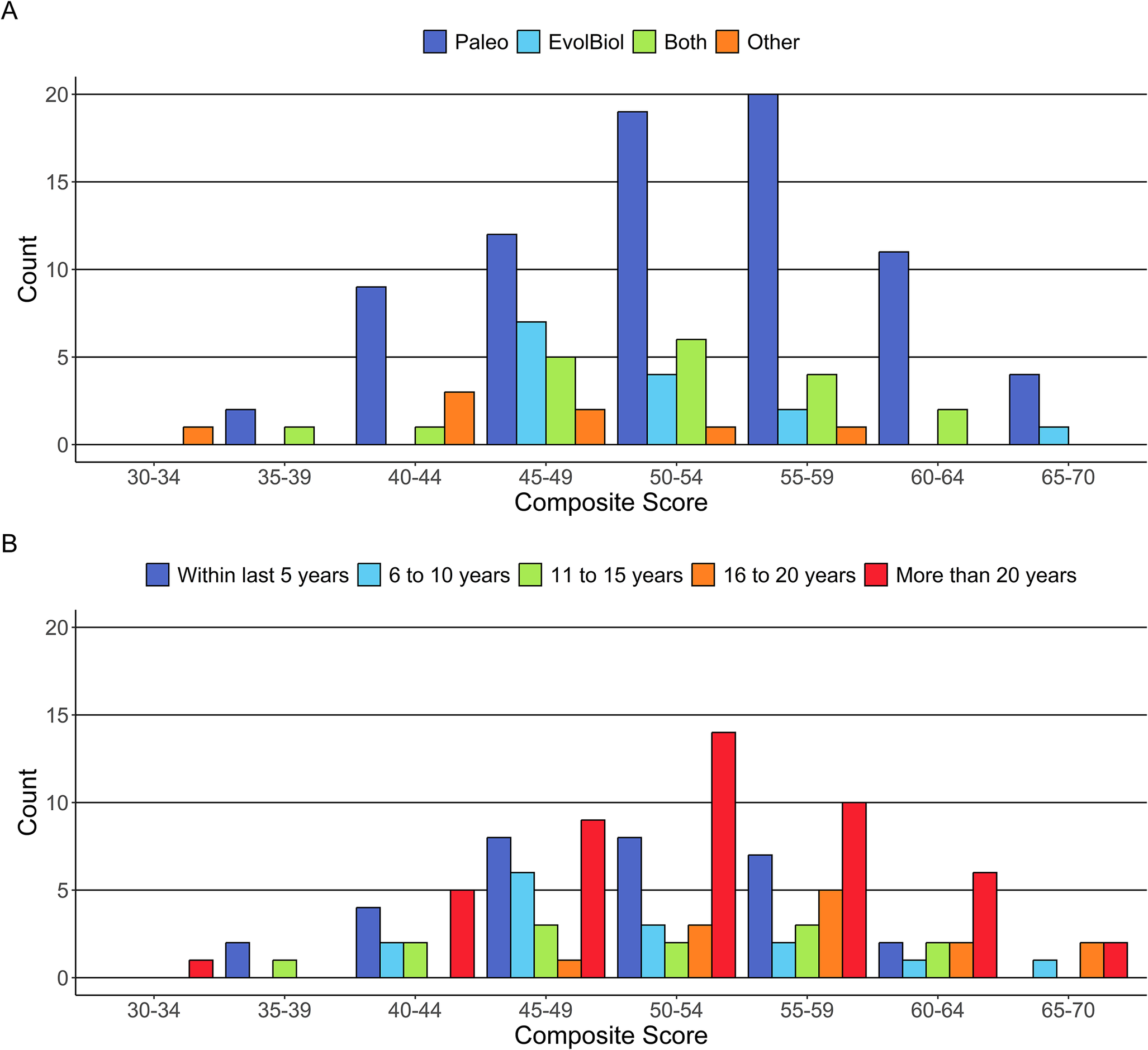 Figure 8. Composite score by (A) discipline and (B) time since highest degree. Analysis of variance (ANOVA) with Tukey’s pairwise comparison shows one significant difference in scores, between those who earned their degree within the last 5 years vs. those who earned their degree between 16 and 20 years ago (p = 0.028). See Table 2 for summary statistics. Abbreviations for disciplines as in Fig. 2.