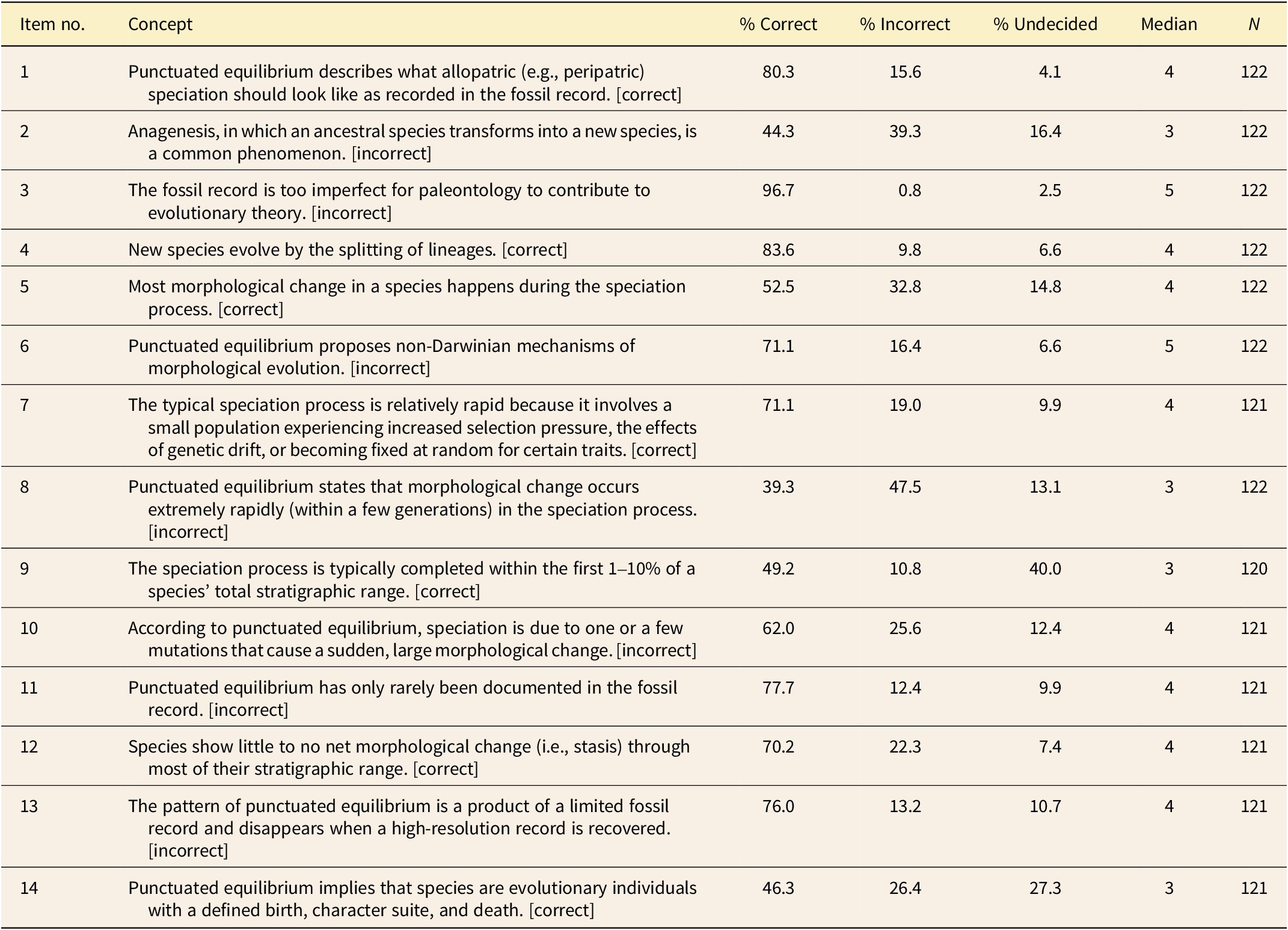 Table 1. Items used to assess the accuracy of conceptions about punctuated equilibrium. Of these 14 statements, 7 are correct and 7 are incorrect, as noted. The percentage of respondents who were correct (that is, agreed with a correct statement or disagreed with an incorrect statement), incorrect, or selected “Undecided” are provided, along with the median value (on 5-point Likert scale) and sample size for each item.