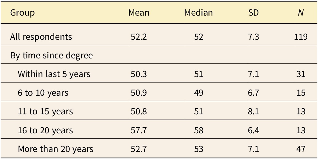 Table 2. Composite scores for all respondents and grouped by time since degree. Composite scores were computed by summing the responses for each of the 14 items (see Table 1), with a minimum possible score of 14 (poor understanding) and maximum possible score of 70 (excellent understanding). Three participants who did not respond to all 14 items were excluded. Analysis of variance (ANOVA) with Tukey’s pairwise comparison shows one significant difference between those who earned their degree within the last 5 years vs. those who earned their degree between 16 and 20 years ago (p = 0.028).