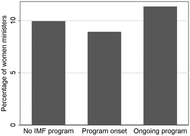 Note: The graph compares the average percentage of women ministers for country‐year observations without an IMF programme, the observations under the first year of an IMF programme and the observations under an ongoing IMF programme beyond its first year. All differences are statistically significant using t‐tests with unequal variance (p < 0.01).